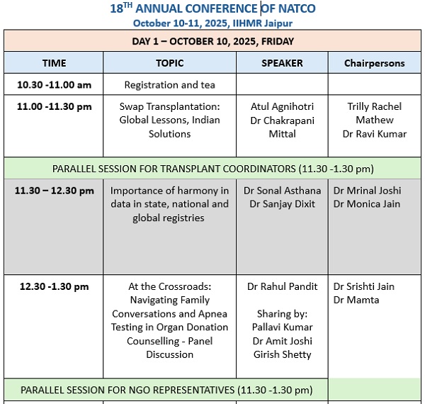 17th Annual International Conference of NATCO on October 19 - 20, 2024 in Ahmedabad, Gujarat. The conference is being organized along with the 34th Annual Conference of The Indian Society of Organ Transplantation (ISOT).